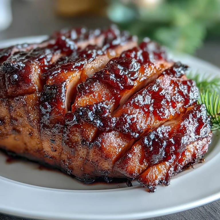 Save Pin A succulent baked ham coated with a luscious glaze of black currant jam and Dijon mustard, perfect for festive gatherings or a special family meal.