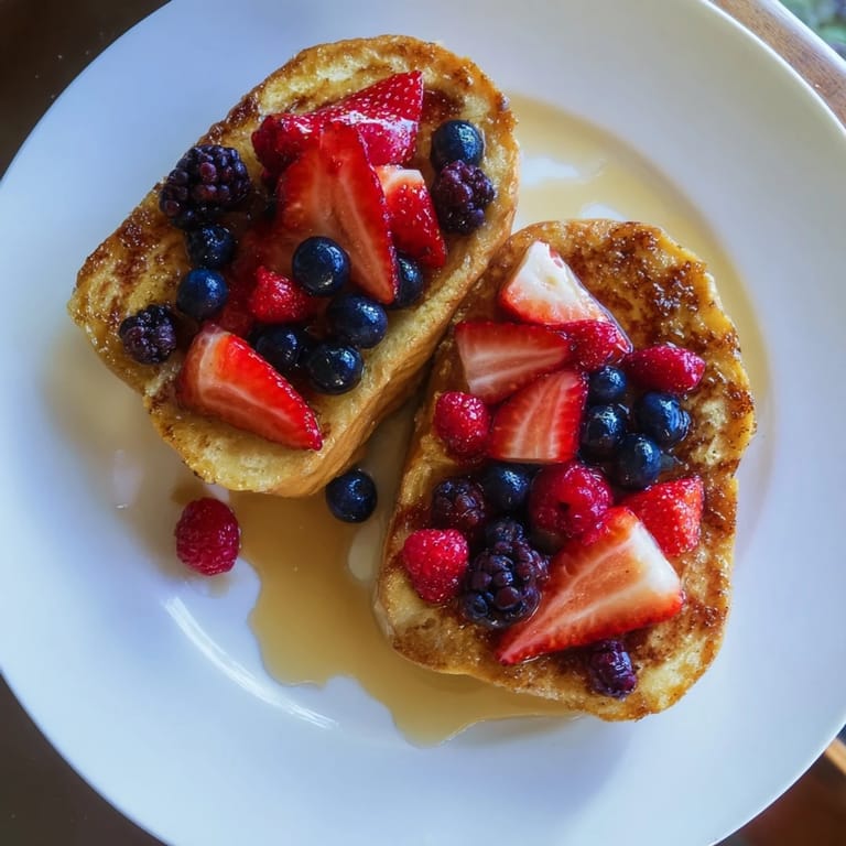 - Arrange French toast slices on plates. Top generously with fresh berries, drizzle with maple syrup, and dust with powdered sugar if desired.