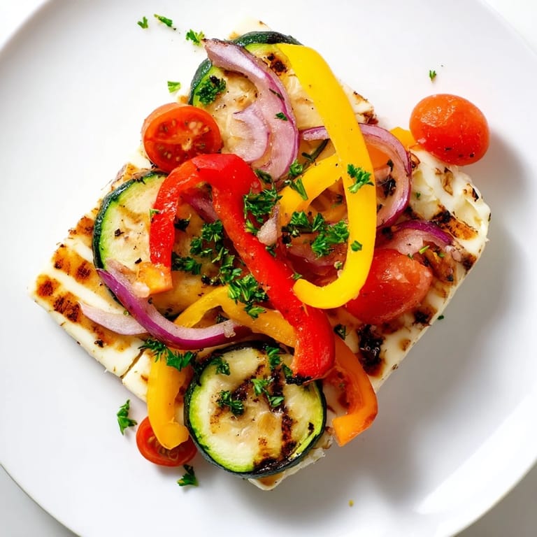 - Arrange your grilled halloumi steaks on a serving platter in whatever pattern feels right, then scatter the warm grilled vegetables over and around them. Top with those fresh cherry tomatoes (which stay bright and uncooked), a generous handful of fresh parsley, and serve immediately with lemon wedges on the side.