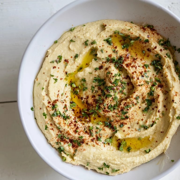 The smooth texture comes from blending chickpeas with tahini, lemon juice, olive oil, and cold water until perfectly creamy.