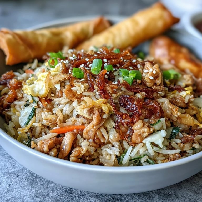 Save Pin One weeknight, my partner came home craving something between takeout and homemade, and I found myself staring at leftover rice and cabbage wondering if I could capture that crispy, savory magic of an egg roll in a pan. What emerged was this dish, and it's been our go-to ever since whenever we want something that feels indulgent but comes together in under forty minutes. The chicken gets golden, the vegetables stay snappy, and somehow the whole thing tastes like comfort wrapped in that familiar egg roll seasoning we both love.